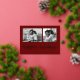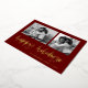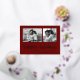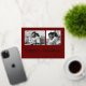 This simple classic dark red family holiday photo card features modern, casual gold foil script typography that says "happy holidays", with a two photo grid on the front for a stylish, modern and minimalist holiday design.