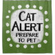An irreverent and cute typographic animal design that says "Cat Alert, Prepare To Pet". It features black and red text on a white rectangle with funky, playful white dots surrounding it, all on a grey background.