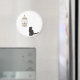 A delightful graphic of a cat silhouette sitting under a little bird in it's cage.