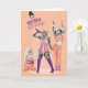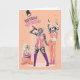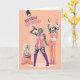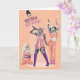 Send all your music-loving superstars this cute birthday card showing Dotty Dog, the Dalmatian, as backing dancer for a singing Kitty, who is performing in a pink leotard and knee high boots. A purple, pink and peach color scheme.