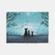 Two dogs and cat silhouette watching the sunset on a winter evening. In colours of blue, black and white. With two trees on both sides and birds flying towards the sunset. Snowflakes falling and a couple of bright stars in the sky. Winter scenery Original Acrylic Painting Art done by Donna Leger for Irony Designs. All Rights Reserved
