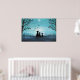 Two dogs and cat silhouette watching the sunset on a winter evening. In colors of blue, black and white. With two trees on both sides and birds flying towards the sunset. Snowflakes falling and a couple of bright stars in the sky. Winter scenery Original Acrylic Painting Art done by Donna Leger for Irony Designs. All Rights Reserved