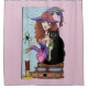 A cute red haired witch all in purple with her black cat sitting on pile of books. Potions, spider and candle all in a backdrop of pink.