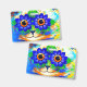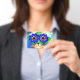 Badge featuring Louis Wain’s animal painting Cat Flower Eyes (1860-1939). A rainbow cat widely grins. Blue flowers cover his eyes. A wonderful gift for cat lovers and English art.