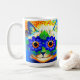 Coffee Mug featuring Louis Wain’s animal painting Cat Flower Eyes (1860-1939). A rainbow cat widely grins. Blue flowers cover his eyes. A wonderful gift for cat lovers and English art.