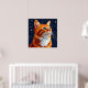 Illustrated artwork of an orange cat with green eyes and white fur, surrounded by a star-filled cosmic background. The scene captures a sense of whimsy and fascination.