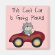 A cat in a red car and text that reads "This Cool Cat is Going Places!" on cat design t-shirts, mugs, cards, stickers, tote bags, keychains, and other iems.