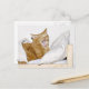 Orange tabby cat waking up with a big yawn in a real bed photo postcard