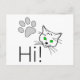Hi text and drawings of a cats face with green eyes and a paw. Cats greetings. Horizontal format products and gifts for fun and laugh.