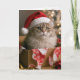 A fluffy cat wearing a Santa hat relaxes in a torn-open gift box, surrounded by a softly blurred backdrop of festive lights that enhance the holiday spirit.
