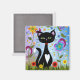 Cute black and white kitty cat with a white love heart on her chest and bright green eyes sitting in some long green grass. She is surrounded by lots of pretty colourful flowers. Leaves and tiny flowers are floating all around her head. Digital abstract folk art designed by C.Katt.