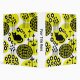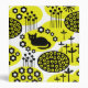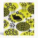 An original and whimsical design featuring a garden like composition with stylized plants and flowers and a little black cat curled up in the grass.