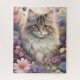 This jigsaw puzzle features a beautiful illustration of a cat surrounded by colorful flowers in a magical garden. The cat has long, fluffy fur with stripes and markings, and intense yellow eyes that look directly at the viewer. The flowers are in full bloom, showcasing vibrant colors such as pink, purple, blue, and white. The background is softly blurred, creating an ethereal atmosphere. This jigsaw puzzle is a perfect gift for cat lovers or anyone who enjoys puzzles.