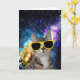 A cute image of a cat wearing yellow sunglasses overlaid on a colourful galaxy / universe; this gives the illusion that the cat is in outer space
