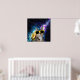 A cute image of a cat wearing yellow sunglasses overlaid on a colourful galaxy / universe; this gives the illusion that the cat is in outer space