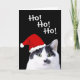 Cute photograph of a grumpy cat in Santa hat with "ho ho ho" text on Christmas greeting card. Blank inside for your own message.