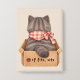 Fluffy grey cat sitting comfortably inside a cardboard box. The txt "If fits, sits" is expressing the cat's innate behavioral rule.