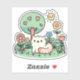 Adorable kawaii sticker featuring a cute cartoon white kitty cat with orange stripes, enjoying her day relaxing in the garden. She is laid on sone bright green grass and surrounded by colourful flowers and an apple tree that has heart shaped apples. A happy yellow sun is smiling down on this whimsical scene.