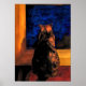 This poster features a gorgeous golden, orange and brown tortoiseshell cat sitting on a red pillow, staring out the window into a midnight blue sky. She casts a shadow on the gold coloured wooden windowsill. I have digitally enhanced my original photograph to achieve a painterly effect.