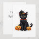 Cute, green eyed, black cat, in a witch costume with two Jack-o-lanterns.