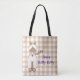 Tan and white gingham all over printed tote, with cute graphics of a cat. Purple text reads Here Kitty Kitty, and can be personalize to read what you want. Cute all purpose tote for any feline fancier.