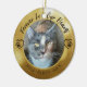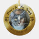 Create a loving, pet memorial photo remembrance tribute keepsake ornament for a beloved cat or kitten with your custom text accented with heart and cat paw print images in your choice of colours against a gold bokeh background. The sample shows FOREVER IN OUR HEARTS in a modern handwritten script and name and years. Make for yourself or as a sympathy gift for a friend or family member grieving the loss of their best four-legged friend. ASSISTANCE: For help with design modification or personalization, colour change, resizing or transferring the design to another product, contact the designer BEFORE ORDERING via the Zazzle Chat MESSAGE tab below or email makeitaboutyoustore@gmail.com.