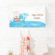 Cat mermaid birthday banner is personalized. There are ocean waves and an adorable cat mermaid, purrmaid, caticorn jumping out and holding a cupcake.