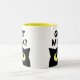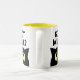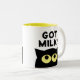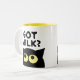 Cat Milk? funny cat meme coffee mug gift for pet owner. Cute white cup with kitty cartoon and humourous quote. Fun gift idea for animal lover, cat owner, cat person, cat dad, pet lover etc. Yellow or custom colour on the inside. Funny cat silhouette with big yellow eyes.