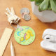 Cat Nap cat is doing what cats do best - napping. She is wearing an adorable pink top with stars and aqua striped sleeves. The moon is hanging above Cat Nap kitty, watching over with a smile. Kitty also has a blissful smile so you know that he is having sweet dreams. Text of “Cat Nap” is on a lime green background sprinkled with yellow stars and pink dots. Cat Nap cat is one of 10 cats from the fabric collection “Meow Meow” by Phyllis Dobbs.