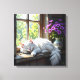 Relaxing and colourful wall art featuring a white fluffy cat napping on a rustic window sill next to a pretty vase of vibrant purple flowers.