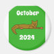 A brown cat is lying down comfortably on a round magnet that has a white and green colour scheme. The cat has medium-brown fur, appearing relaxed with its body slightly curled. The magnet underneath features the words "October 2024" clearly visible, and the green and white colours create an attractive contrast. The overall scene is calm and cozy, with the cat resting on the smooth surface of the magnet.