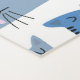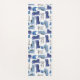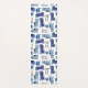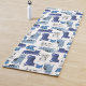 A yoga mat with a pattern of blue and grey cats on a white background, next to a white-water bottle, on a light wood floor. The cats are in various poses, such as lying down, stretching, and sitting. The pattern is dense and covers the entire mat. The water bottle is tall and cylindrical, with a black cap. The floor is made of light-coloured wood planks. The lighting is bright and even. The style is cartoonish.