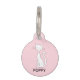 Fun cat identification tag with a cute white cat with a pink nose and collar sitting sideways and smiling. Personalize with her name and your contact information.