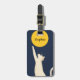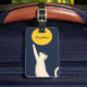 Minimalist illustration of a white cat reaching toward a large yellow moon against a deep blue sky. The serene composition evokes curiosity and wonder, making it a perfect design for a luggage tag that symbolizes dreams and aspiration.