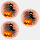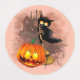 Fun cat Cartoon looking very scared by a spooky Halloween Pumpkin, and climbing on a witch broom to escape. Original Vector Art Copyright BluedarkArt TheChameleonArt.