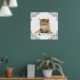 Clever tabby cat appears to be reading a book. Cat has glasses and book is open in front. Corners of print has scroll accents in soft blue.