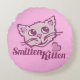 Fun cat lovers graphic round pink pillow cushion. Ideal for cat lovers or those in love or both!. Reads smitten kitten. Original art and design by Sarah Trett.