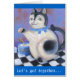 Blue greeting card with print from painting entitled "Vintage Cat Teapot" and text: "Let's get together... It's Tea time!"