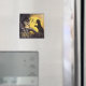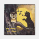 Vintage Halloween postcard showing a somewhat fraught cat screeching a warning to the wide-eyed owl in the tree. Reprinted on this magnet.