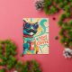 Retro-style cartoon cat wearing oversized sunglasses, holding a coffee cup. Bold 80s-inspired colours (teal, mustard, coral) with a halftone texture background with Playful slogan like ‘Paws for Coffee’ in a vintage script font."