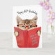 Cute tabby cat with red glasses reading a red book on white background for 60th birthday.