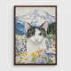 A stunning illustration of a black-and-white cat with striking heterochromia—one golden eye and one blue—surrounded by vibrant wildflowers in yellow, purple, and white. The majestic mountain range in the background and lush greenery complete this captivating and peaceful scene.