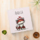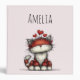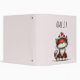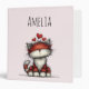 A binder with a whimsical drawing featuring a big orange red kitty cat.
