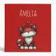 A binder with a whimsical drawing featuring a big orange red kitty cat.