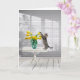 Mother's Day yellow tulip bouquet on old wooden table and playful grey tabby cat.