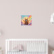 This fantasy poster features an orange tabby cat angel wearing a gold halo, sitting down on a soft dreamy cluster of clouds with a beautiful rainbow and the radiant sun. Finished as an oil paint print.