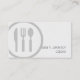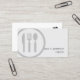 In this caterer food and service business card, a big bold translucent black icon of cutlery sits on the left side of the card. The background is a soothing off-white paper texture, with your name and title appearing in simple easy to read black letters on the lower right. Your other contact details appear on the back of the card. Perfect for food, service, restaurant, eatery, cooking, hospitality, professional themes.
