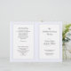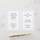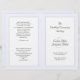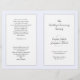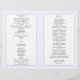 Pale periwinkle blue and white wedding ceremony programs with text template areas to accommodate a longer, Catholic ceremony. Black elegant font is printed over white panels on the front and back. Fold in half after receiving which will put the scripture and thank-you message on the back of the program. On the reverse (which will be the centre pages of the program) include the order of the ceremony and the wedding party section to list all the people involved in making the day so special. Although this sample program is set up for a Catholic service, use it for any type of wedding. Add spaces to make the wording fit better.