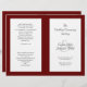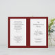 Folded wedding program template for a catholic ceremony. This layered-look program contains white panels over dark wine red colour. Each page has space for lots of text to accommodate an involved ceremony. The last page (back of program) includes a section for scripture (sample is "love is patient" from 1 Corinthians) and a message from the bride and groom.
