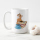Cute orange cat, blue coffee cup and pile of books. Book lovers quote coffee mug.